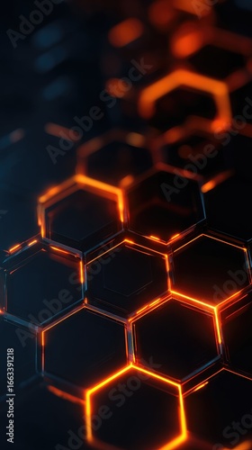 Glowing orange hexagons form a dark, abstract, three-dimensional honeycomb pattern, with blurred edges and depth of field