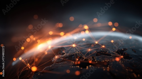 Glowing orange network connections highlight continents across a dark, blurred space, with a view of illuminated lines and points, creating a futuristic and technological illustration