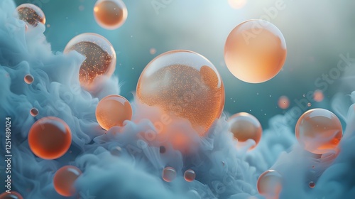 Glowing orange spheres floating in misty blue clouds create dreamy atmospheric composition, abstract macro photography with soft bokeh effect and depth of field.