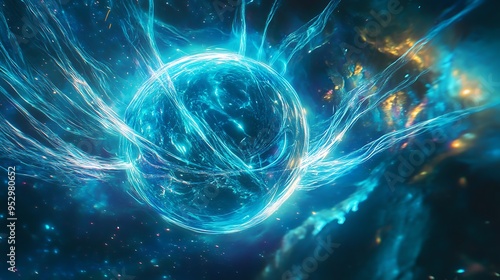 Glowing Orb Surrounded by Ethereal Blue Lines in a Cosmic Setting