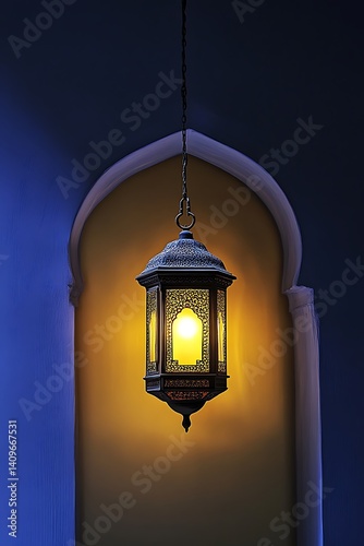 Glowing Ornate Lantern Hanging in Dark Archway