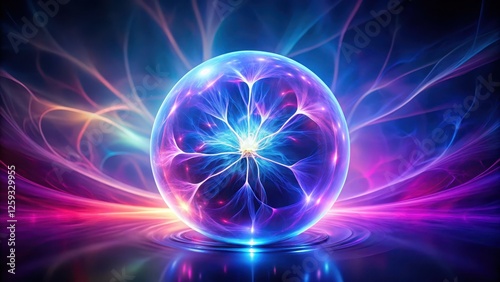 Glowing plasma ball floating in a dark abstract background with swirling purple and blue hues, aurora-inspired , cosmic scene