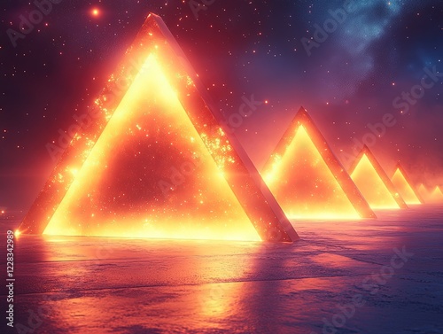 Glowing pyramids line horizon under a dark, starry sky. Possible use for fantasy, sci-fi
