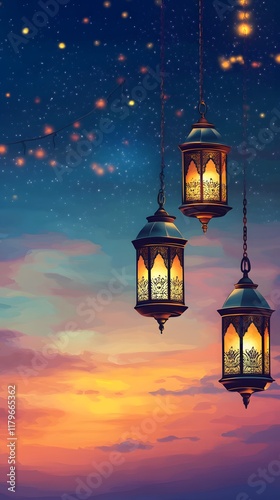 Glowing Ramadan lanterns under a stunning sunset background, peaceful evening atmosphere, extra space is provided for text