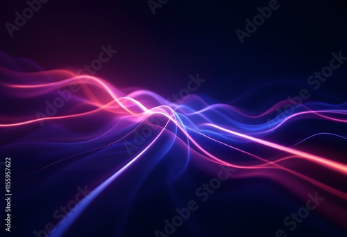 Glowing red and blue neon light waves on dark background. Abstract energy flow pattern. Dynamic electric lines. Modern tech design for banner, poster with copy space
