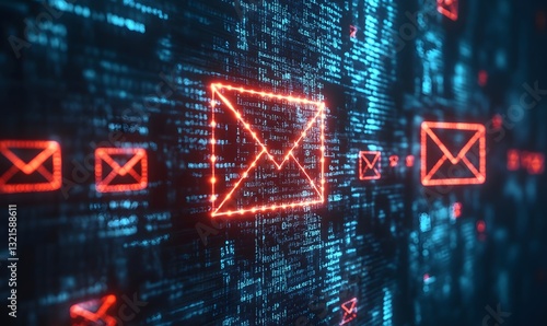 glowing red email symbols floating across a digital data stream, representing the flow of communication and information in a digital world