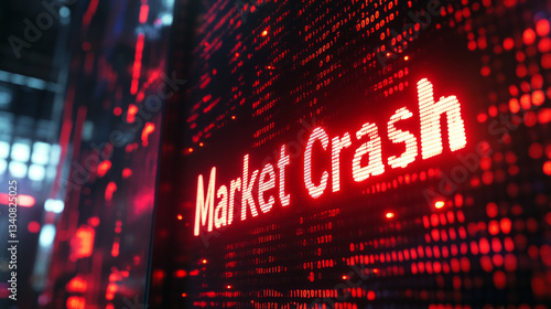 Glowing red warning sign displays market crash alert in financial district during evening hours