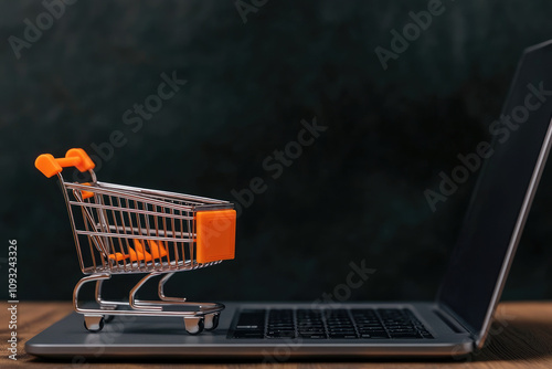 Glowing shopping cart on laptop, vibrant 3D illustration, engaging digital commerce concept, inviting foreground space for text.