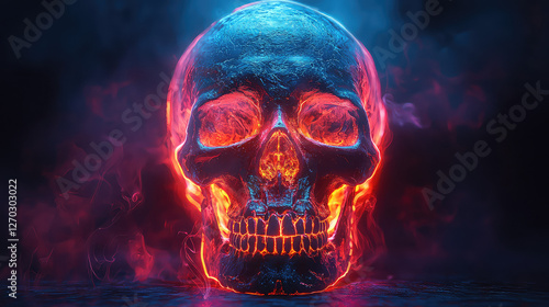 Glowing skull engulfed in vibrant red and blue flames, dark background.