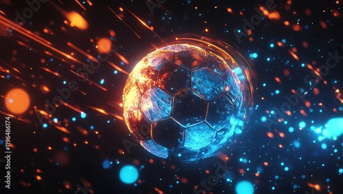 Glowing soccer ball with fiery trails and sparks.