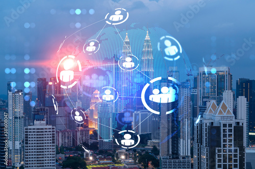 Glowing Social media icons on night panoramic city view of Kuala Lumpur, Malaysia, Asia. The concept of networking and connections between people and businesses in KL. Double exposure.