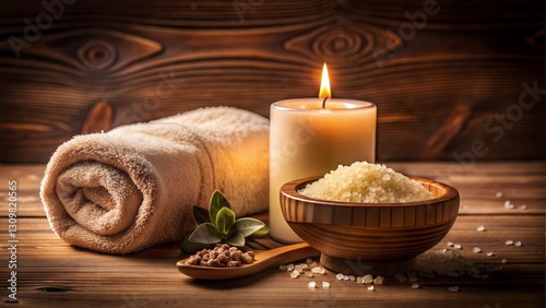 Glowing Spa Candle Next to a Towel and Bath Salt