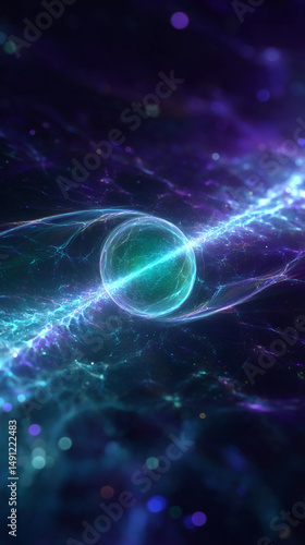Glowing sphere amidst swirling, blue-purple energy streams, creating a dynamic, cosmic scene, symbolizing power, energy, and the universe