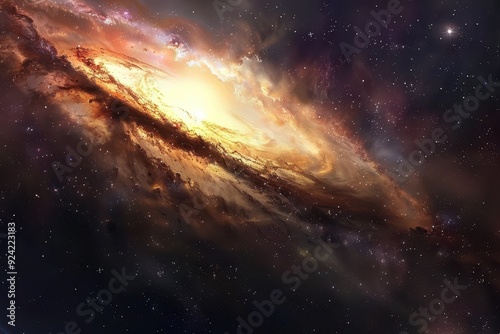 Glowing spiral galaxy with bright center and dust formations in deep space