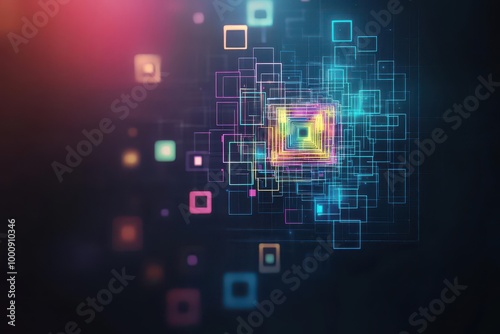 Glowing squares arranged in a spiral formation, vibrant neon colors, dark space background, abstract scifi concept,