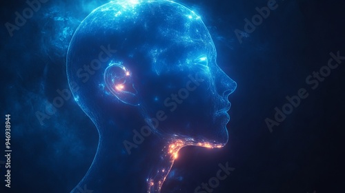 Glowing, translucent, blue human head in profile, emanating light, against a dark background, suggesting a futuristic or digital theme