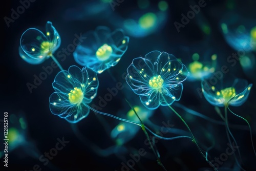 Glowing translucent flowers with bright centers, dark background, ethereal beauty.