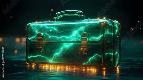 Glowing turquoise briefcase with electric lightning effect against dark background, mysterious atmosphere with golden light reflections and bokeh elements.