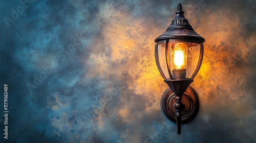 Glowing vintage wall lamp on textured background.