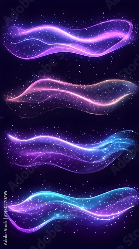 Glowing, wavy light streaks in purple, pink, and blue hues on a dark background. Sparkling particles enhance the ethereal effect