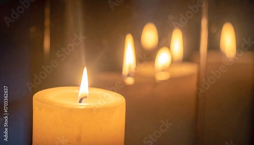 Glowing Wax Candle Flame Reflections on Glass in Dim Light Warm Atmosphere