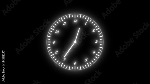 Glowing White Clock Face on Black Background Showing Time Around Ten After Twelve neon white