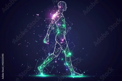 Glowing Wireframe Human Figure Walking in a Digital Space