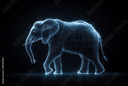 Glowing wireframe of an elephant on a transparent background, highlighted by a combination of blue and black data points, symbolizing the intersection of nature and technology.