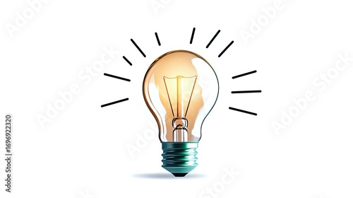 Glowing yellow light bulb with green base and radiating lines on white background, symbolizing innovation, creativity and bright ideas for business concepts.