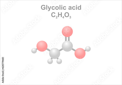 Glycolic acid. Simplified scheme of the molecule. Use in the textile industry as dyeing, tanning agent.