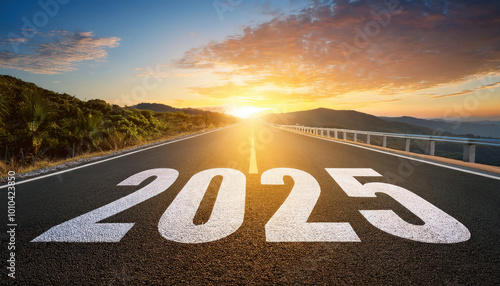 Go to the New Year 2025. Happy New Year greeting card 2025, Happy New Year 2025 letters on the road