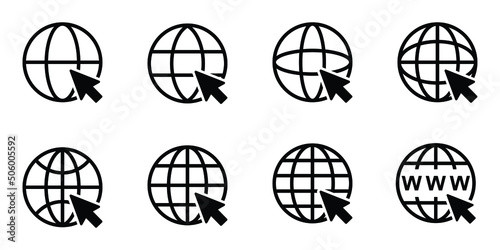 Go to web icon set. Globe with cursor. Site, internet click concept. Vector illustration isolated on white background. EPS 10.