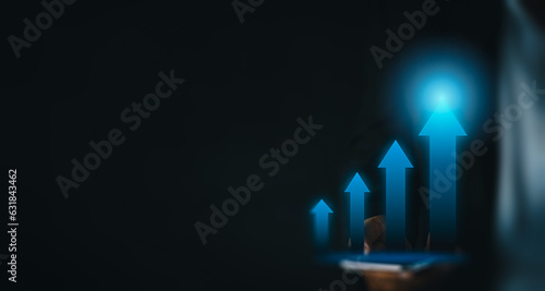 Goal and Achviement concept.,Businessman using smartphone with virtual growth arrow graph over black background with copyspace perfect for technology,business idea.