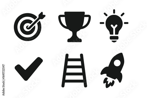 Goal icon set. Business success and achievement symbols. Solid glyph icons for motivation, target, trophy, idea, checkmark, ladder, and rocket launch. Vector career growth.