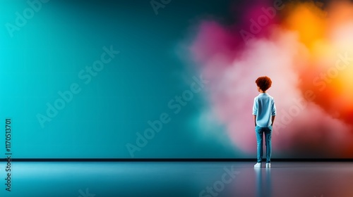 Goal of life, happiness and dreams concept: Child looking at a painting coming to life, vivid colors, representing creative dreams.