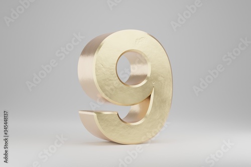 Gold 3d number 9. Golden number isolated on white background. 3d rendered font character.