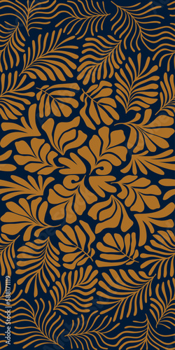 Gold abstract background with tropical palm leaves in Matisse style. Vector seamless pattern with Scandinavian cut out elements.