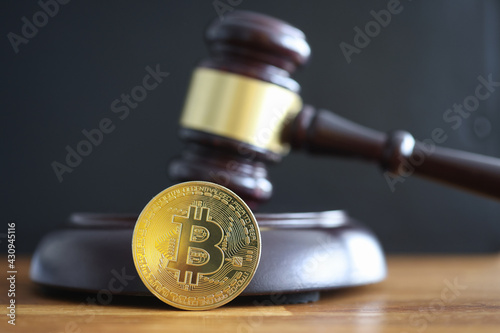 Gold coin bitcoin lying next to judge hammer closeup