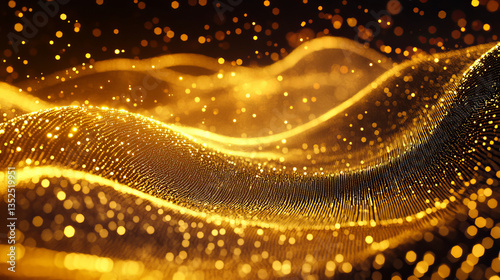 Gold color digital particles wave flow Or diffuse by the wind of the sand. Abstract technology background concept