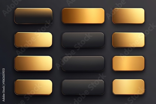 Gold color gradient rectangle button set vector illustration on dark background, flat design, vector graphics, flat style, 2D design, simple lines and shapes, flat color blocks