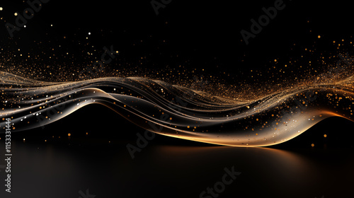 Gold confetti glittering wave. Golden sparkling on black background. Shiny wavy crumbs, golden texture