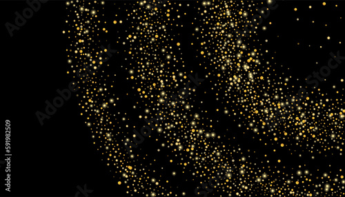 Gold glitter confetti on a black background. Shiny particles scattered, sand. Decorative element. Luxury background for your design, cards, invitations, vector