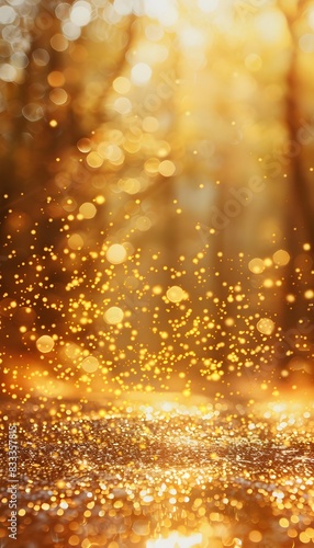 gold glitter, sparkling and shining with a bokeh effect blurred forest in the background