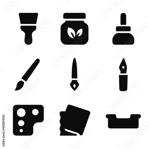 Gold Leaf Tools Icons. Solid, filled icon set of gold leaf calligraphy tools: gilding brush, shell gold jar, adhesive pot,