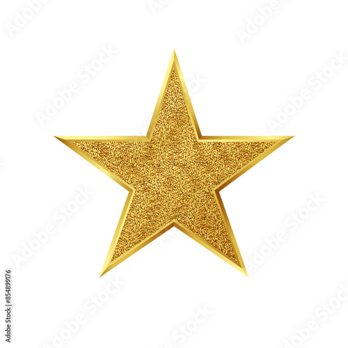 Gold luxury five-pointed 3D star with glitter and shimmer texture. Vector stock illustration.