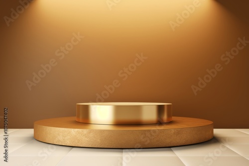 Gold podium with a golden charm display on a neutral background, illuminated by soft light, perfect for showcasing products or awards