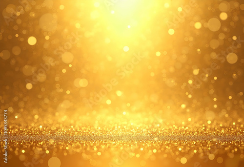 Gold Sparkling Lights Festive background with texture. Abstract Christmas twinkled bright bokeh and Falling stars. Winter Card or invitation.