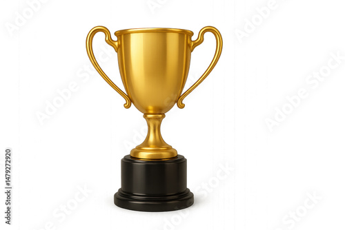 Gold trophy on black pedestal isolated on transparent background.