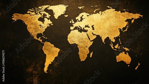 Gold world map on dark textured background Detailed continents and oceans stand out vividly