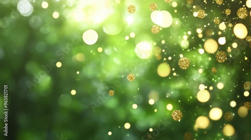 Golden and green confetti bokeh sparkles brightly in sunlight, creating a vibrant atmosphere in a verdant garden